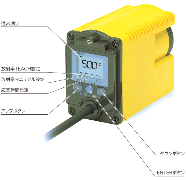 | 功能 | 轻松的发射率校正:TEACH 功能 响应时间选择 (DELAY) 功能:1(0.5 秒)~ 200(约 10 秒) |