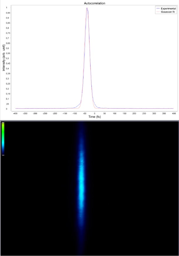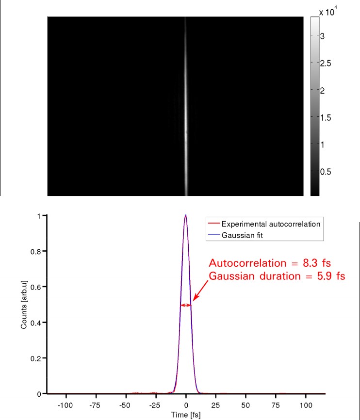 上图为空间分辨自相关轨迹原始图像;下图为自相关轨迹分析耦合结果,试验数据(红线)被拟合成高斯函数(蓝线)。自相关轨迹的半高全宽是8.3fs,对应的高斯脉宽为5.9fs。 图3. 低能量激光脉冲宽度测量结果(STFE-ROC FC-400测试Ti:Sapph振荡器,测量的平均功率仅为20mW,重复率为62MHz,单脉冲能量为0.3nJ)。下图是空间分辨自相关轨迹原始图像。上图自相关轨迹在分析耦合结果。实验数据(蓝线)被拟合成高斯函数(红线)。自相关轨迹的半高全宽为30.4fs,对应的高斯脉宽为21.5fs。