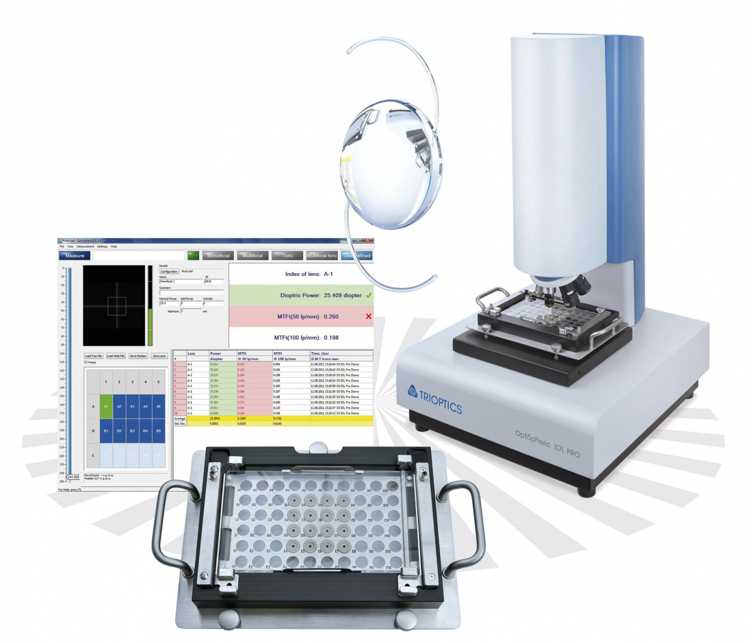 德国全欧(TRIOPTICS)设计、生产的人工晶状体波前测量仪 Trioptics WaveMaster® IOL是一款通过测量波前来检测人工晶状体的新型设备,它可以测量和分析人工晶状体的实时光学波前面。基于这种测量模式,无论是球面、非球面、环曲面、单焦和多焦的人工晶状体都可以被测量。WaveMaster® IOL也可以附加基于ISO11979标准的模拟眼来模拟人眼的状态进行测量。该款仪器在研发和量产型检测中都有着广泛的应用。