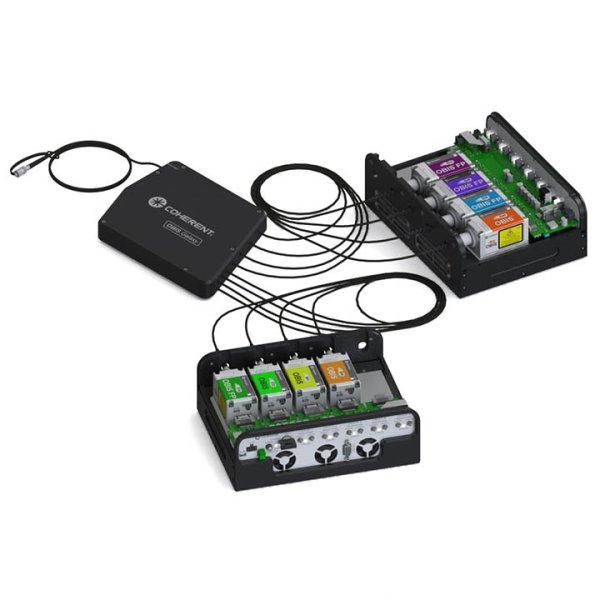 新! OBIS Galaxy 集成系统可预装 3、4 或 5 个激光器,并包括一个用于成套激光引擎的激光盒。