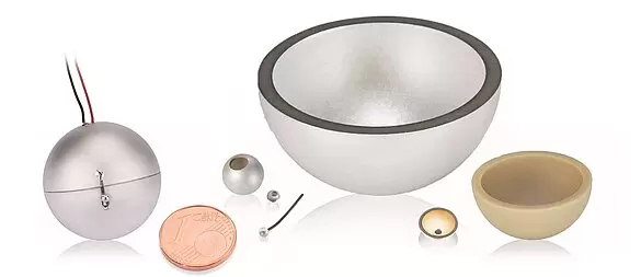 PI普爱 PIC 144 压电球体和半球体 压电陶瓷空心球体、半球体、聚焦碗 应用领域 医用HIFU 治疗性超声 声纳换能器 水听器 PI Ceramic开发和生产各种几何形状和电极设计(如有接触和无接触)的客户定制型半球体和空心球体以及聚焦碗。 从用于医疗技术的小型球体到用于水声应用和产生高强度聚焦超声(HIFU)的大型组件,压电陶瓷球体都具有高灵敏度和耐用性。 典型配置 按客户要求设计 几何形状变化,例如轴环、整平、相位、带孔或不带孔的球体 定制直径的聚焦碗 各种电极设计,例如环绕电极或激光成型 根据几何形状设置频率 通过焊接绞线或导线接触 OD 外径[mm] ID 内径[mm] TH 厚度[mm] H 高度[mm] 规格 空心球体 半球体 聚焦碗 材料 PI...
