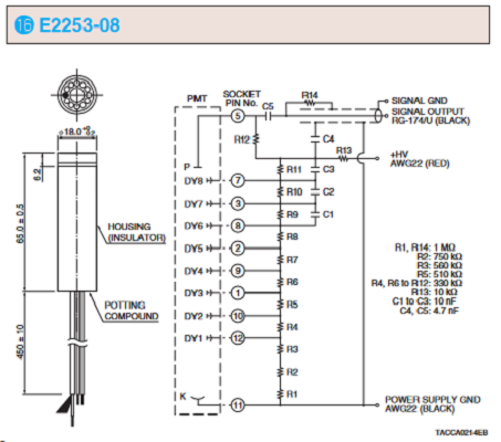 HAMAMATSU滨松 D型插座组件 E2253-08 详细参数 适用的 PMT 19 mm 端窗型 电源电压极性 + [Max. Rating] 绝缘电压(机箱 - 引脚) 1800 V [Max. Rating] 电源电压 1800 V [Max. Rating] 分压器电流 0.36 mA 总分压器电阻 5.13 MΩ 备注 适用于 R3478,用于闪烁计数 0755-89355351 手机/微信:13242449659 QQ:842471885