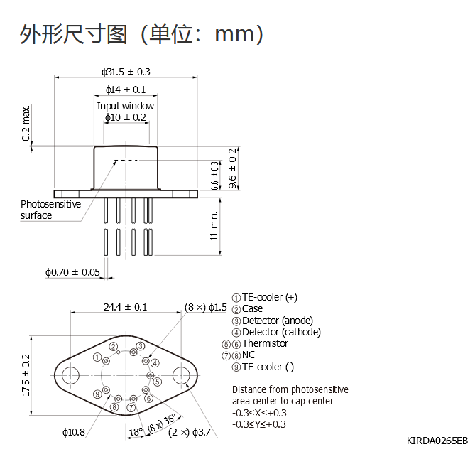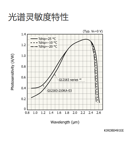 | 测量条件 | 典型值 Tc = -20°C,除非另有说明,感光灵敏度:λ = λp,暗电流:VR = 10 mV,截止频率:VR = 0 V,RL = 50 Ω,结电容:VR = 0 V,f = 1 MHz |