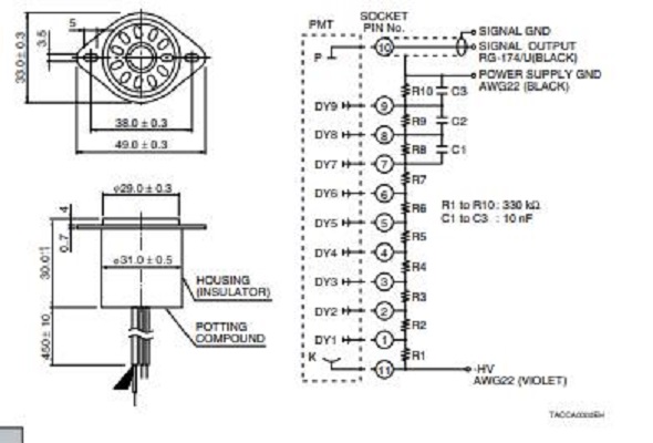 HAMAMATSU滨松 侧面式光电倍增管 R7446 详细参数 类型 侧面式 管子尺寸 28 mm 直径 光阴极面区域形状 正方形 光阴极面区域尺寸 8 x 24 mm 波长(短) 160 nm 波长(长) 680 nm 波长(峰值) 400 nm 光阴极面材料 低噪声双碱 窗材 石英 倍增器电极结构 圆形罩壳 倍增器电极级数 9 [Max. Rating] 阳极至阴极电压 1250 V [Max. Rating] 平均阳极电流 0.1 mA 阳极至阴极电源电压 1000 V [Cathode] 亮度灵敏度最小值 40 μA/lm [Cathode] 亮度灵敏度典型值 60 μA/lm [Cathode] 蓝敏度指数 (CS 5-58) 典型值 6.4 [Cathode] 辐射灵敏度典型值 60 mA/W [Anode] 亮度灵敏度最小值 200 A/lm [Anode] 亮度灵敏度典型值 400 A/lm [Anode] 辐射灵敏度典型值 4.0 x 105 A/W [Anode] 增益率典型值 6.7 x 106 [Anode] 暗电流(30 分钟后) 典型值 0.1 nA [Anode] 暗电流(30 分钟后) 最大值 2 nA [Time Response] 上升时间典型值 2.2 ns [Time Response] 渡越时间典型值 22 ns [Time Response] 渡越时间分散度典型值 1.2 ns ...