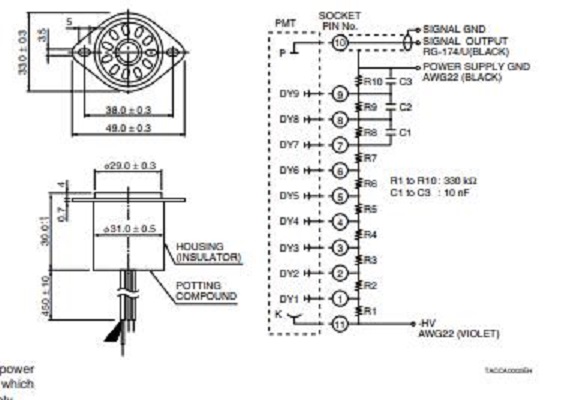 HAMAMATSU滨松 侧面式光电倍增管 R10699 详细参数 类型 侧面式 管子尺寸 28 mm 直径 光阴极面区域形状 正方形 光阴极面区域尺寸 8 x 24 mm 波长(短) 185 nm 波长(长) 900 nm 波长(峰值) 450 nm 光谱灵敏度特性曲线代码 557U 光阴极面材料 多碱 窗材 紫外玻璃 倍增器电极结构 圆形罩壳 倍增器电极级数 9 [Max. Rating] 阳极至阴极电压 1250 V [Max. Rating] 平均阳极电流 0.1 mA 阳极至阴极电源电压 1000 V [Cathode] 亮度灵敏度最小值 620 μA/lm [Cathode] 亮度灵敏度典型值 650 μA/lm [Cathode] 蓝敏度指数 (CS 5-58) 典型值 15 [Cathode] 红白比 (R-68) 典型值 0.43 [Cathode] 辐射灵敏度典型值 109 mA/W [Anode] 亮度灵敏度最小值 1600 A/lm [Anode] 亮度灵敏度典型值 8500 A/lm [Anode] 辐射灵敏度典型值 1.4 x 106 A/W [Anode] 增益率典型值 1.3 x 107 [Anode] 暗电流(30 分钟后) 典型值 2 nA [Anode] 暗电流(30 分钟后) 最大值 10 nA [Time Response] 上升时间典型值 2.2 ns [Time Response...