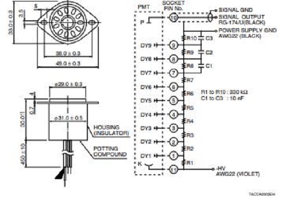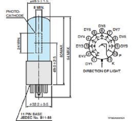 HAMAMATSU滨松 侧面式光电倍增管 R11558 详细参数 类型 侧面式 管子尺寸 28 mm 直径 光阴极面区域形状 正方形 光阴极面区域尺寸 8 x 24 mm 波长(短) 300 nm 波长(长) 650 nm 波长(峰值) 400 nm 光谱灵敏度特性曲线代码 453K 光阴极面材料 双碱 窗材 硼硅玻璃 倍增器电极结构 圆形罩壳 倍增器电极级数 9 [Max. Rating] 阳极至阴极电压 1250 V [Max. Rating] 平均阳极电流 0.1 mA 阳极至阴极电源电压 1000 V [Cathode] 亮度灵敏度最小值 40 μA/lm [Cathode] 亮度灵敏度典型值 60 μA/lm [Cathode] 蓝敏度指数 (CS 5-58) 典型值 7.1 [Cathode] 辐射灵敏度典型值 60 mA/W [Anode] 亮度灵敏度最小值 200 A/lm [Anode] 亮度灵敏度典型值 600 A/lm [Anode] 辐射灵敏度典型值 6.0 x 105 A/W [Anode] 增益率典型值 1.0 x 107 [Anode] 暗电流(30 分钟后) 典型值 1 nA [Anode] 暗电流(30 分钟后) 最大值 10 nA [Time Response] 上升时间典型值 2.2 ns [Time Response] 渡越时间典型值 22 ns 0755-89355351  ...