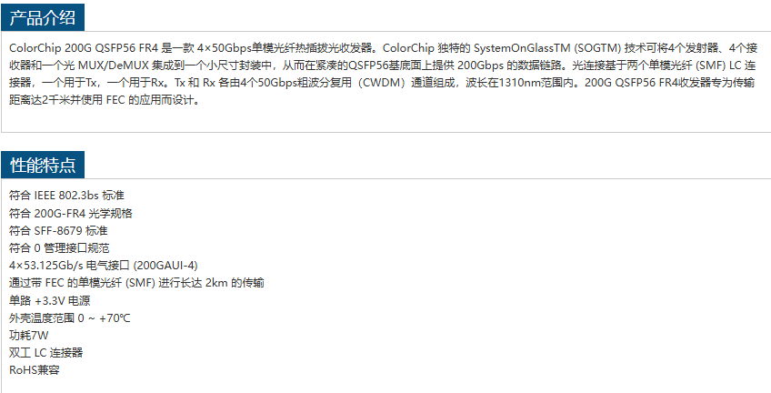 ColorChip单模光纤200G QSFP56 FR4 lite 手机/微信:13242449659电话:0755-89355351 QQ:842471885 邮箱:842471885@qq.com