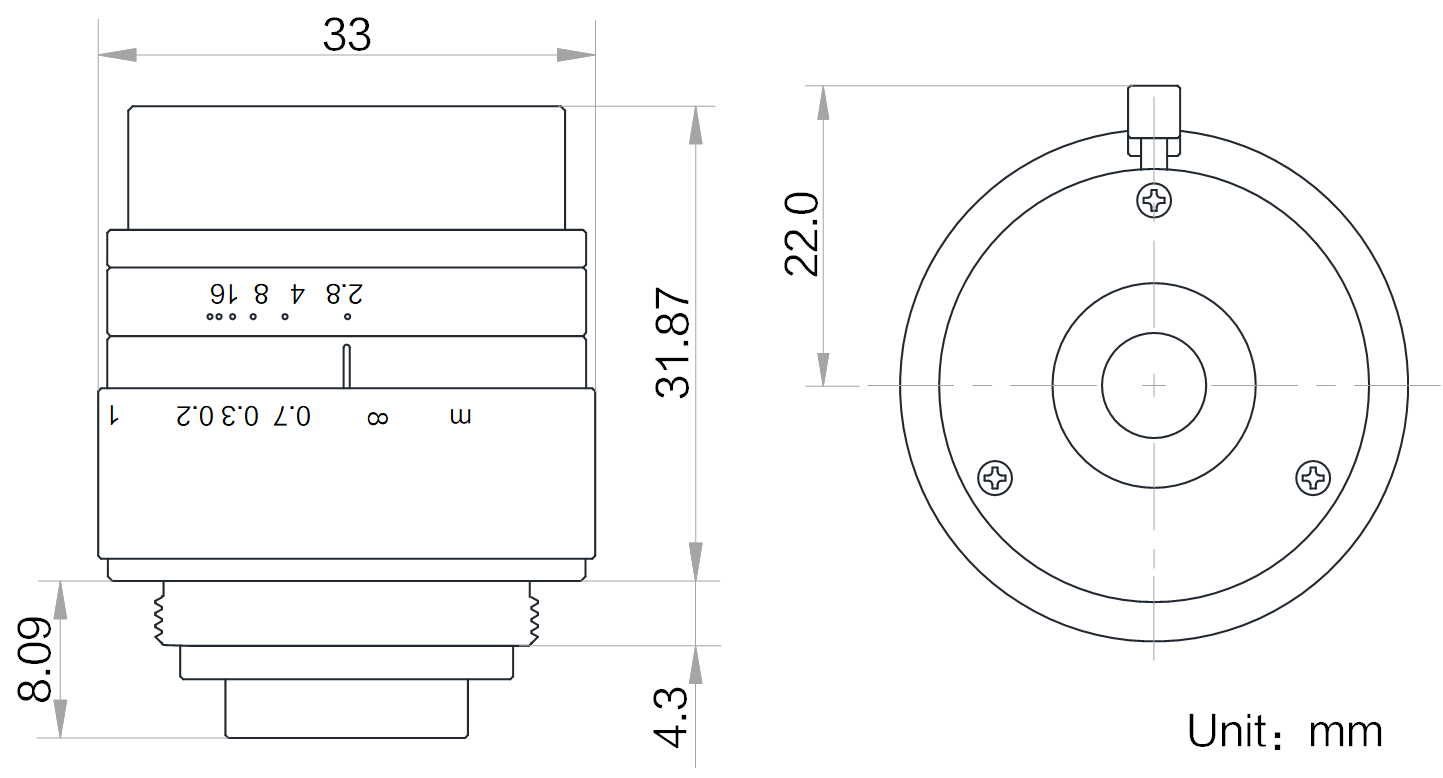| 名称 | 16mm,F2.8,1/1.8",600万分辨率,C接口镜头 | |