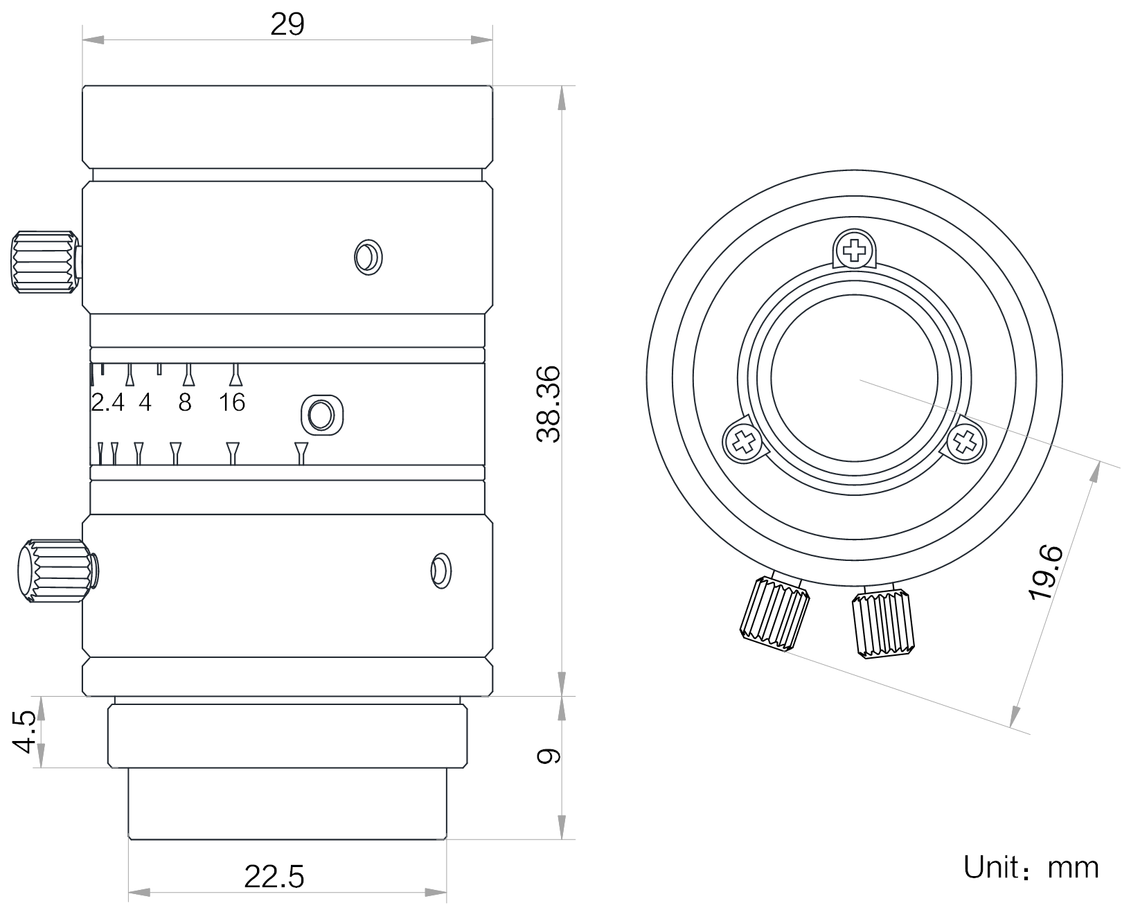 | 名称 | 16mm,F2.4,1/1.8",1000万分辨率,C接口镜头 | |