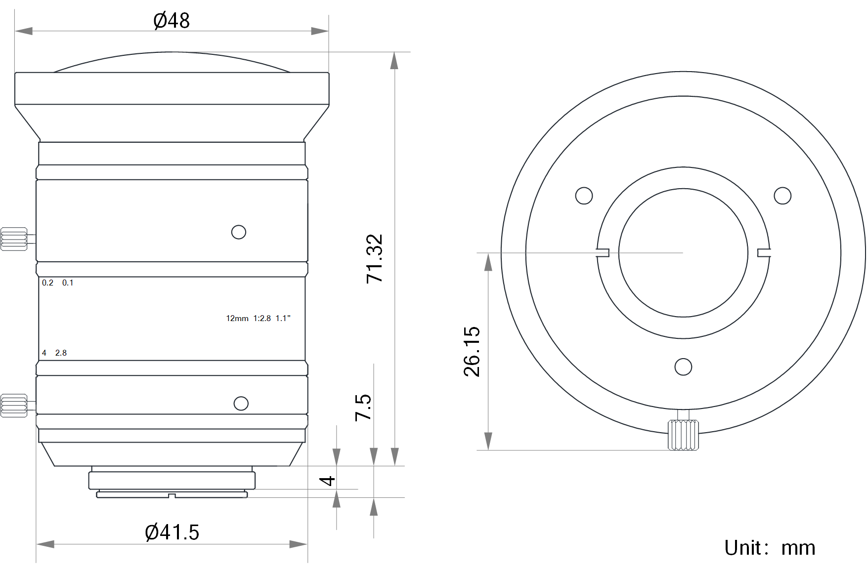 | 名称 | 12mm,F2.8,1.1",1200万分辨率,C接口镜头 | |